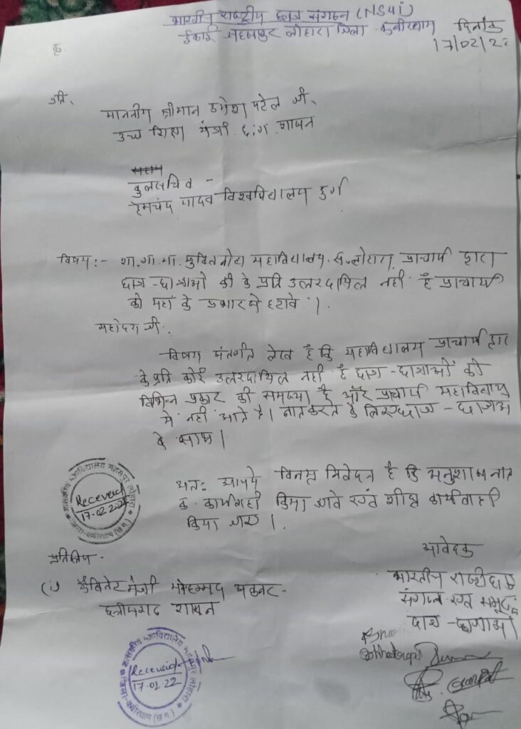 उच्च शिक्षा मंत्री के नाम पर महाविद्यालय में ज्ञापन सौंपा गया जिसमें महाविद्यालय प्राचार्य को प्रभार से हटाने के लिए