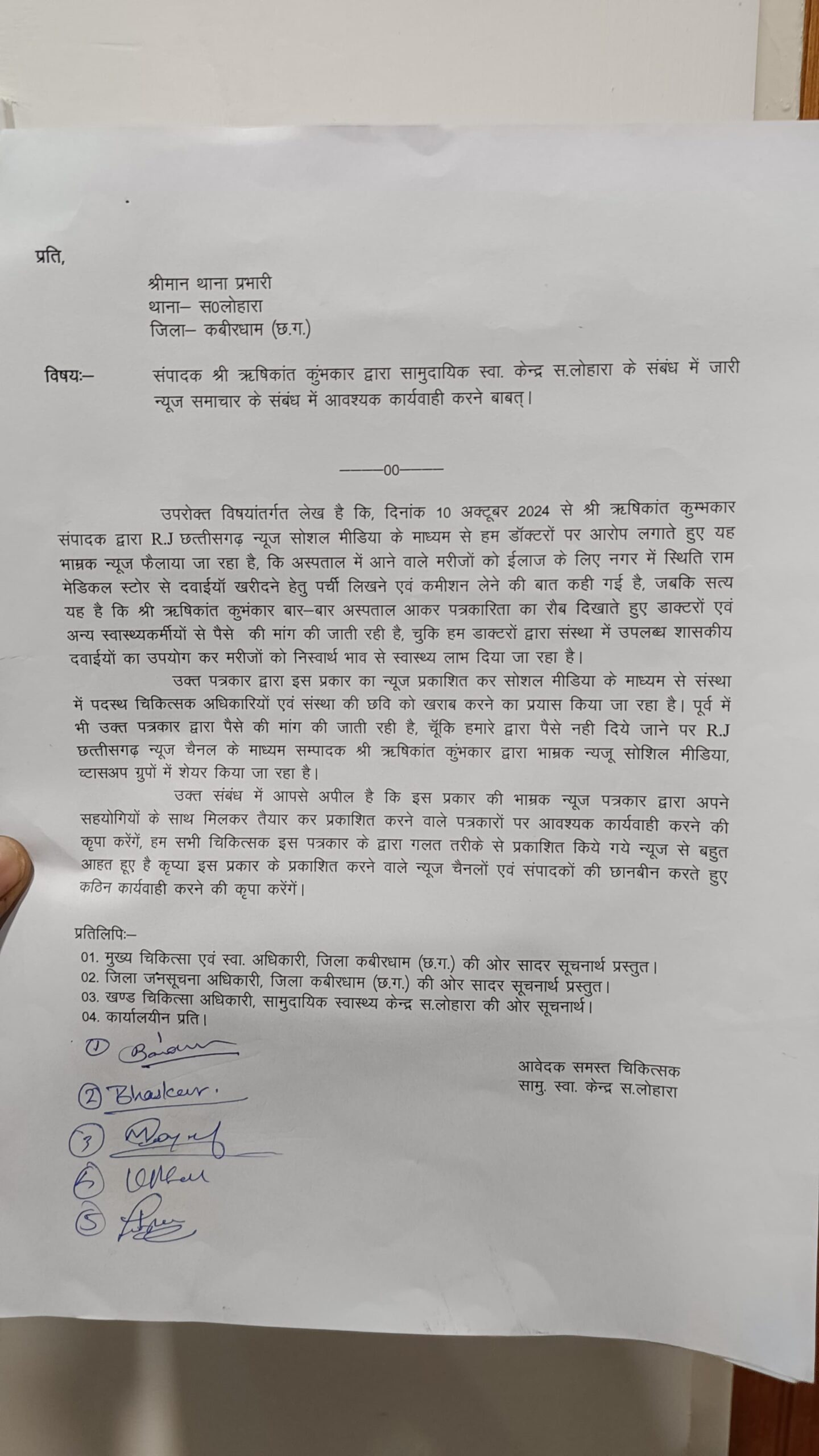 पूरा मामला कवर्धा लोहारा सामुदायिक स्वास्थ्य केंद्र का है जहां पर आर जे छत्तीसगढ़ संपादक के द्वारा जाकर बाहरी दवाई लिखा जाता है करके खबर परसारित किया जाता है जिसकी सच्चाई कितनी है यह जांच का विषय है डॉक्टरों ने ऋषि कुंभकार के खिलाफ थाने में आवेदन दिए हैं अब देखना यह है कि क्या एफ आई आर होती है कि नही